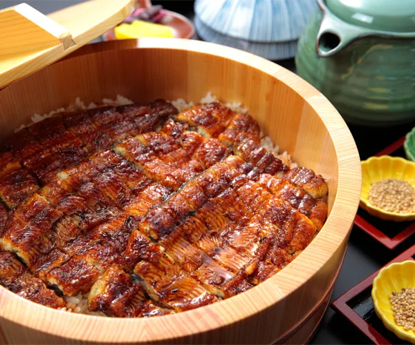 桶に入った「鰻桶まぶし」を是非みなさんでシェアして召し上がってください。桶のフタを開けた時に、びっくりすること間違いなしです!