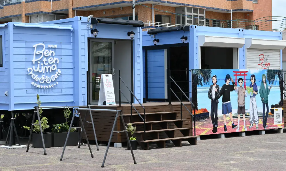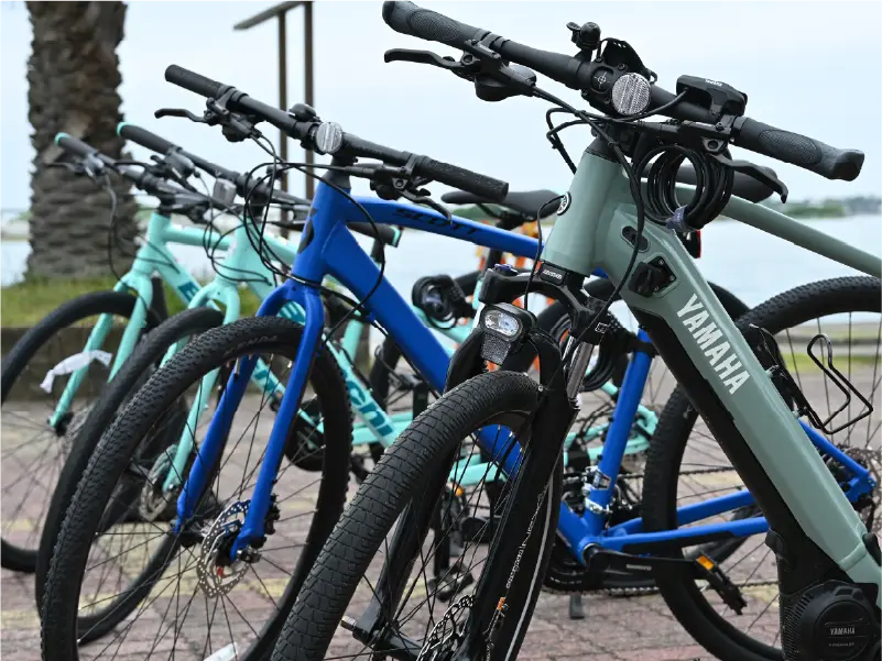 オープンした弁天島サイクルゲートは、ビーチ沿いにある弁天島海浜公園にピッタリなブルーの建物が目印です。おしゃれなコンテナ型の施設では、最新e-bike(電動アシスト付き)やスポーツバイク、コンパクトで可愛らしいミニベロまで多彩な自転車をレンタルできます!