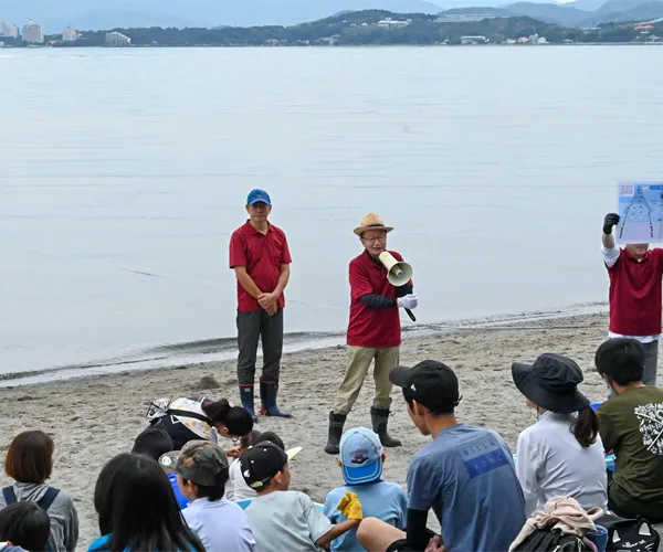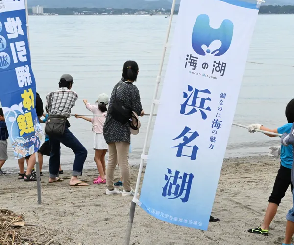 舘山寺公共駐車場から徒歩5分、かんざんじサンビーチで体験する、浜名湖の恵みを獲る地引網。汽水湖の浜名湖には700種類以上が生息する魚介類の中から、何が獲れるかな!